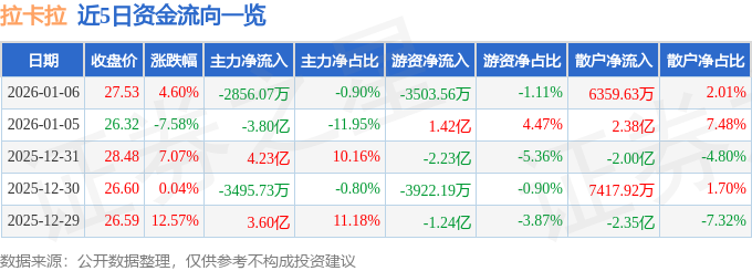 证券之星消息,截至2026年1月6日收盘,拉卡拉(300773)报收于27.53元,上涨4.6%,换手率15.74%,成交量115.59万手,成交额31.7亿元。