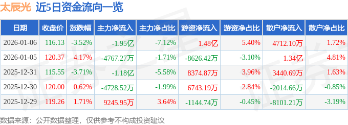证券之星消息,截至2026年1月6日收盘,太辰光(300570)报收于116.13元,下跌3.52%,换手率12.35%,成交量23.74万手,成交额27.35亿元。