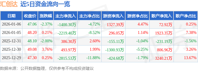 证券之星消息,截至2026年1月6日收盘,汇创达(300909)报收于47.06元,下跌2.37%,换手率5.1%,成交量6.24万手,成交额2.97亿元。