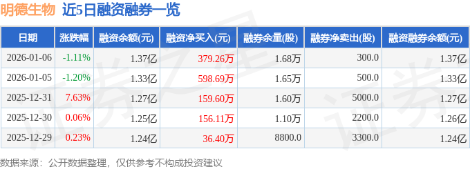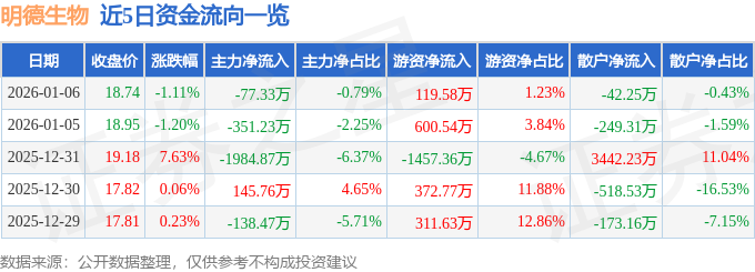 证券之星消息,截至2026年1月6日收盘,明德生物(002932)报收于18.74元,下跌1.11%,换手率3.33%,成交量5.2万手,成交额9737.79万元。