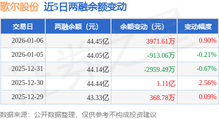 证券之星消息,1月6日,歌尔股份(002241)融资买入5.44亿元,融资偿还5.04亿元,融资净买入3931.45万元,融资余额44.36亿元,近20个交易日中有14个交易日出现融资净买入。