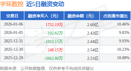 证券之星消息,1月6日,宇环数控(002903)融资买入3266.49万元,融资偿还1514.3万元,融资净买入1752.19万元,融资余额2.6亿元。