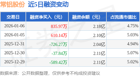 证券之星消息,1月6日,常铝股份(002160)融资买入5698.59万元,融资偿还4862.63万元,融资净买入835.97万元,融资余额2.18亿元。
