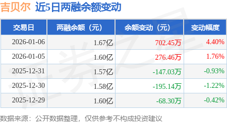 证券之星消息,1月6日,吉贝尔(688566)融资买入1129.65万元,融资偿还427.36万元,融资净买入702.29万元,融资余额1.66亿元。