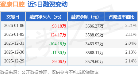 证券之星消息,1月6日,登康口腔(001328)融资买入569.58万元,融资偿还471.4万元,融资净买入98.18万元,融资余额3686.27万元。