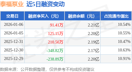 证券之星消息,1月6日,泰福泵业(300992)融资买入664.88万元,融资偿还573.46万元,融资净买入91.41万元,融资余额2.21亿元,近3个交易日已连续净买入累计427.07万元,近20个交易日中有11个交易日出现融资净买入。