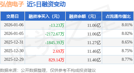 证券之星消息,1月6日,弘信电子(300657)融资买入8314.39万元,融资偿还8327.62万元,融资净卖出13.23万元,融资余额11.06亿元。