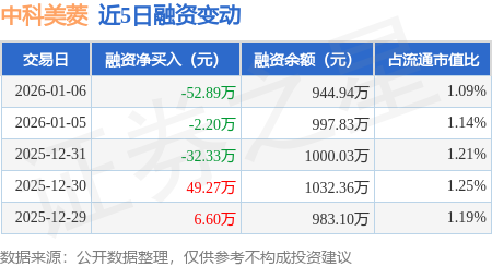 证券之星消息,1月6日,中科美菱(920992)融资买入99.97万元,融资偿还152.86万元,融资净卖出52.89万元,融资余额944.94万元。
