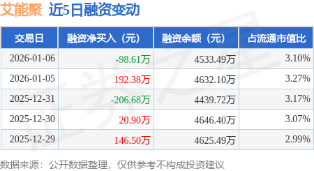证券之星消息,1月6日,艾能聚(920770)融资买入285.56万元,融资偿还384.17万元,融资净卖出98.61万元,融资余额4533.49万元。