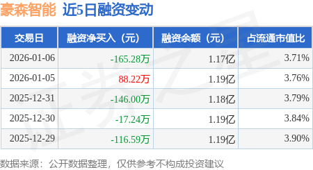 证券之星消息,1月6日,豪森智能(688529)融资买入475.57万元,融资偿还640.85万元,融资净卖出165.28万元,融资余额1.17亿元。