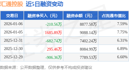 证券之星消息,1月6日,汇通控股(603409)融资买入680.25万元,融资偿还890.81万元,融资净卖出210.56万元,融资余额8877.58万元,近20个交易日中有11个交易日出现融资净买入。