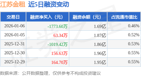证券之星消息,1月6日,江苏金租(600901)融资买入862.24万元,融资偿还2635.84万元,融资净卖出1773.6万元,融资余额1.69亿元,近20个交易日中有12个交易日出现融资净买入。