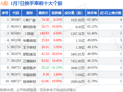 当日A股换手率前10大个股中9只个股收涨,平均涨幅9.08%,其中C新广益(301687)以换手率65.38%排第一,4只个股近5个交易日中多次上榜。