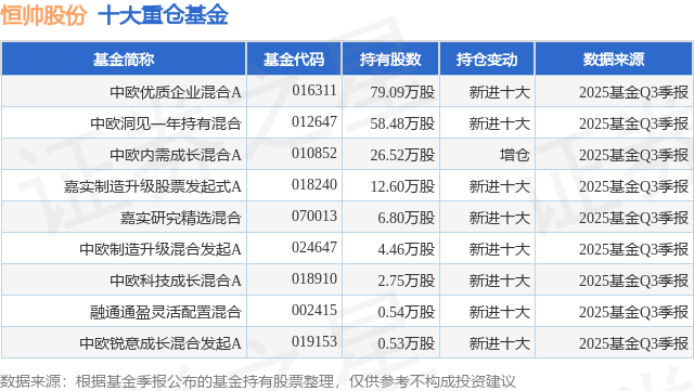 根据2025基金Q3季报公募基金重仓股数据,重仓该股的公募基金共9家,其中持有数量最多的公募基金为中欧基金的中欧优质企业混合A。中欧优质企业混合A目前规模为20.06亿元,最新净值1.3787(1月6日),较上一交易日上涨1.35%,近一年上涨63.61%。该公募基金现任基金经理为代云锋。代云锋在任的基金产品包括:中欧洞见一年持有混合,管理时间为2022年7月7日至今,期间收益率为27.89%;中欧科技成长混合A,管理时间为2024年2月2日至今,期间收益率为106.22%。