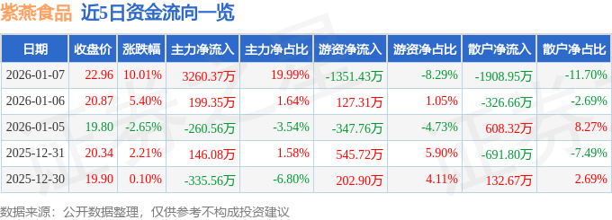 证券之星消息,截至2026年1月7日收盘,紫燕食品(603057)报收于22.96元,上涨10.01%,涨停,换手率1.79%,成交量7.37万手,成交额1.63亿元。