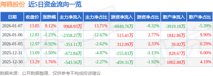 证券之星消息,截至2026年1月7日收盘,海鸥股份(603269)报收于13.85元,上涨8.12%,换手率17.03%,成交量52.59万手,成交额7.27亿元。