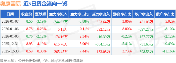 证券之星消息,截至2026年1月7日收盘,奥康国际(603001)报收于8.5元,下跌3.19%,换手率2.44%,成交量9.78万手,成交额8387.15万元。