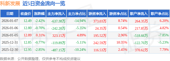 证券之星消息,截至2026年1月7日收盘,科新发展(600234)报收于12.49元,下跌2.42%,换手率1.29%,成交量3.38万手,成交额4266.9万元。