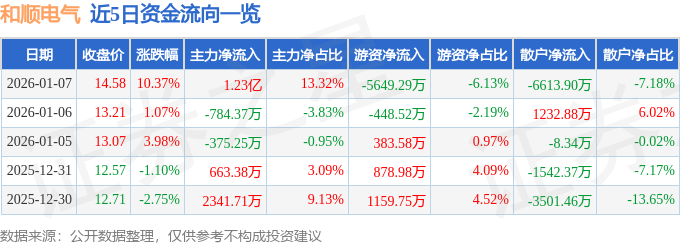 证券之星消息,截至2026年1月7日收盘,和顺电气(300141)报收于14.58元,上涨10.37%,换手率23.77%,成交量60.56万手,成交额9.21亿元。