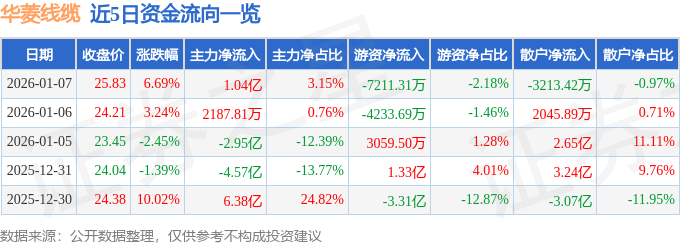 证券之星消息,截至2026年1月7日收盘,华菱线缆(001208)报收于25.83元,上涨6.69%,换手率49.69%,成交量130.87万手,成交额33.12亿元。