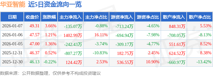 证券之星消息,截至2026年1月7日收盘,华亚智能(003043)报收于49.31元,上涨3.66%,换手率3.75%,成交量3.15万手,成交额1.53亿元。