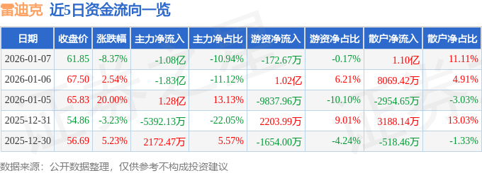 证券之星消息,截至2026年1月7日收盘,雷迪克(300652)报收于61.85元,下跌8.37%,换手率13.06%,成交量15.64万手,成交额9.87亿元。