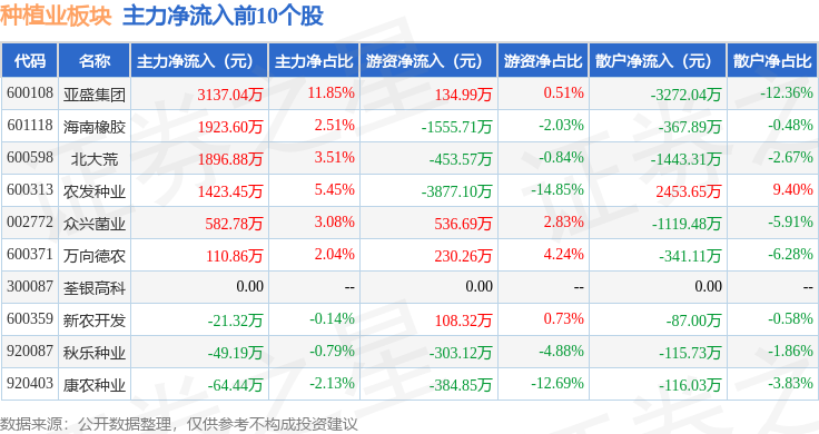 从资金流向上来看,当日种植业板块主力资金净流出9550.92万元,游资资金净流出1401.32万元,散户资金净流入1.1亿元。种植业板块个股资金流向见下表: