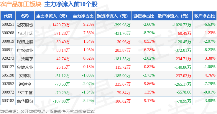 从资金流向上来看,当日农产品加工板块主力资金净流出1.82亿元,游资资金净流入5426.06万元,散户资金净流入1.27亿元。农产品加工板块个股资金流向见下表: