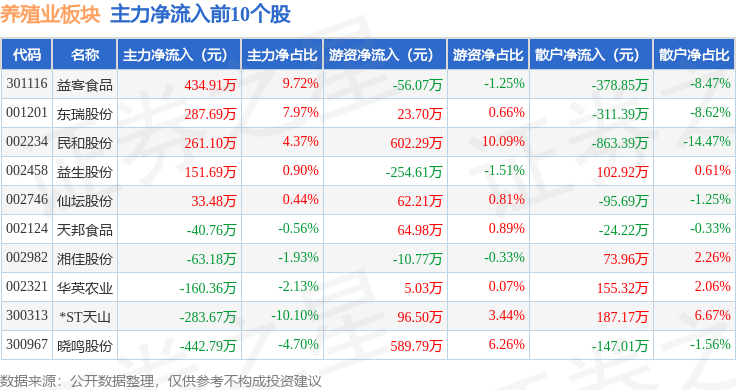 从资金流向上来看,当日养殖业板块主力资金净流出2.29亿元,游资资金净流入5403.51万元,散户资金净流入1.75亿元。养殖业板块个股资金流向见下表: