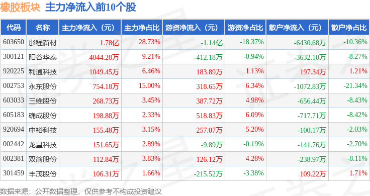 从资金流向上来看,当日橡胶板块主力资金净流入1.29亿元,游资资金净流出6901.67万元,散户资金净流出5955.56万元。橡胶板块个股资金流向见下表:
