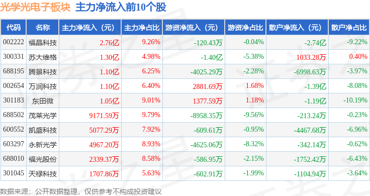 从资金流向上来看,当日光学光电子板块主力资金净流出12.26亿元,游资资金净流入1.15亿元,散户资金净流入11.1亿元。光学光电子板块个股资金流向见下表: