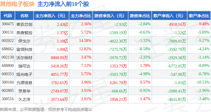 从资金流向上来看,当日其他电子板块主力资金净流入6.39亿元,游资资金净流出3.78亿元,散户资金净流出2.61亿元。其他电子板块个股资金流向见下表: