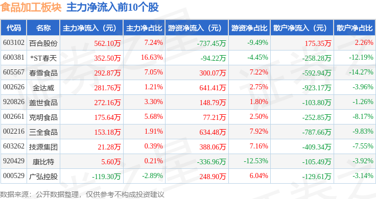 从资金流向上来看,当日食品加工板块主力资金净流出1.84亿元,游资资金净流入1.01亿元,散户资金净流入8324.4万元。食品加工板块个股资金流向见下表: