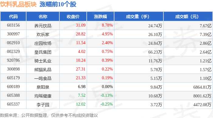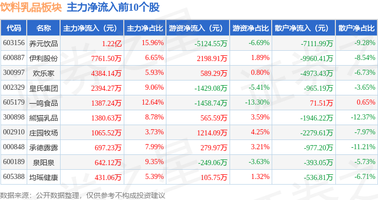 从资金流向上来看,当日饮料乳品板块主力资金净流入1.77亿元,游资资金净流出1600.51万元,散户资金净流出1.61亿元。饮料乳品板块个股资金流向见下表:
