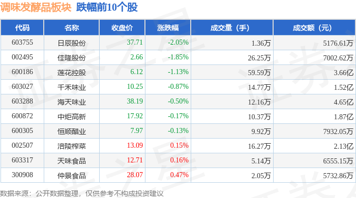证券之星消息,1月7日调味发酵品板块较上一交易日下跌0.07%,日辰股份领跌。当日上证指数报收于4085.77,上涨0.05%。深证成指报收于14030.56,上涨0.06%。调味发酵品板块个股涨跌见下表:
