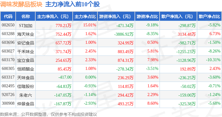 从资金流向上来看,当日调味发酵品板块主力资金净流出6839.03万元,游资资金净流出852.99万元,散户资金净流入7692.01万元。调味发酵品板块个股资金流向见下表: