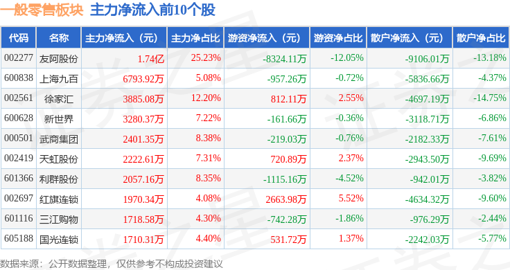 从资金流向上来看,当日一般零售板块主力资金净流出3.46亿元,游资资金净流入2.01亿元,散户资金净流入1.45亿元。一般零售板块个股资金流向见下表: