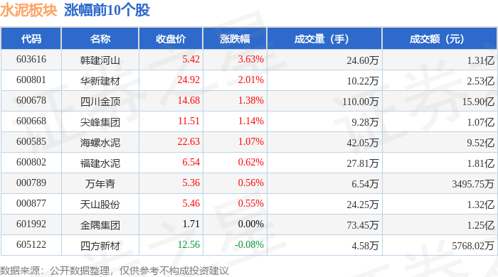 证券之星消息,1月7日水泥板块较上一交易日上涨0.46%,韩建河山领涨。当日上证指数报收于4085.77,上涨0.05%。深证成指报收于14030.56,上涨0.06%。水泥板块个股涨跌见下表: