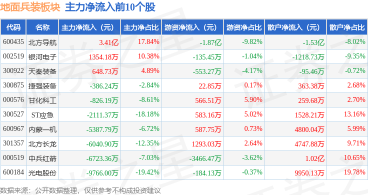 从资金流向上来看,当日地面兵装板块主力资金净流出2.22亿元,游资资金净流出1.46亿元,散户资金净流入3.68亿元。地面兵装板块个股资金流向见下表: