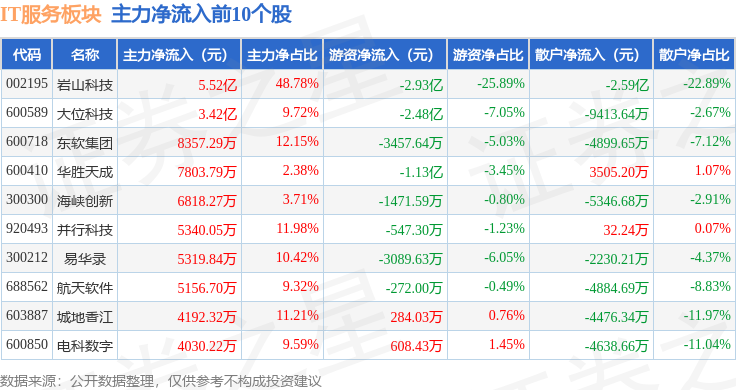 从资金流向上来看,当日IT服务板块主力资金净流出21.15亿元,游资资金净流出2.37亿元,散户资金净流入23.52亿元。IT服务板块个股资金流向见下表:
