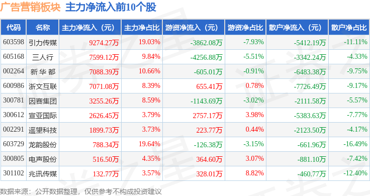 从资金流向上来看,当日广告营销板块主力资金净流出10.59亿元,游资资金净流入2.62亿元,散户资金净流入7.97亿元。广告营销板块个股资金流向见下表: