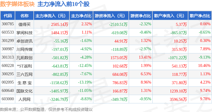 从资金流向上来看,当日数字媒体板块主力资金净流出5.31亿元,游资资金净流入4154.18万元,散户资金净流入4.9亿元。数字媒体板块个股资金流向见下表: