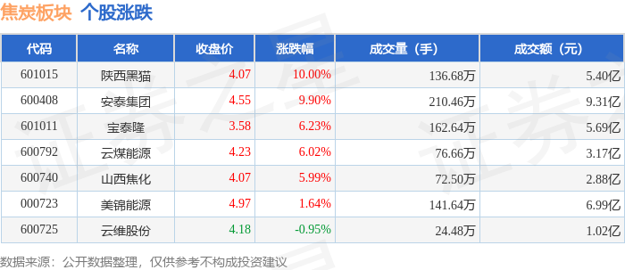 证券之星消息,1月7日焦炭板块较上一交易日上涨4.61%,陕西黑猫领涨。当日上证指数报收于4085.77,上涨0.05%。深证成指报收于14030.56,上涨0.06%。焦炭板块个股涨跌见下表: