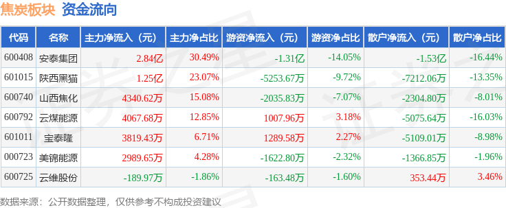 从资金流向上来看,当日焦炭板块主力资金净流入5.59亿元,游资资金净流出1.99亿元,散户资金净流出3.6亿元。焦炭板块个股资金流向见下表: