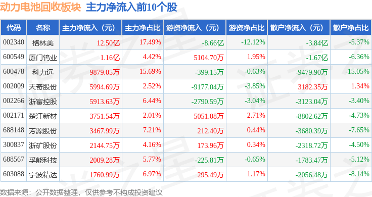 从资金流向上来看,当日动力电池回收板块主力资金净流出24.51亿元,游资资金净流出4.27亿元,散户资金净流入28.78亿元。动力电池回收板块个股资金流向见下表: