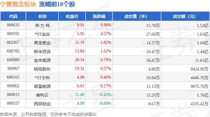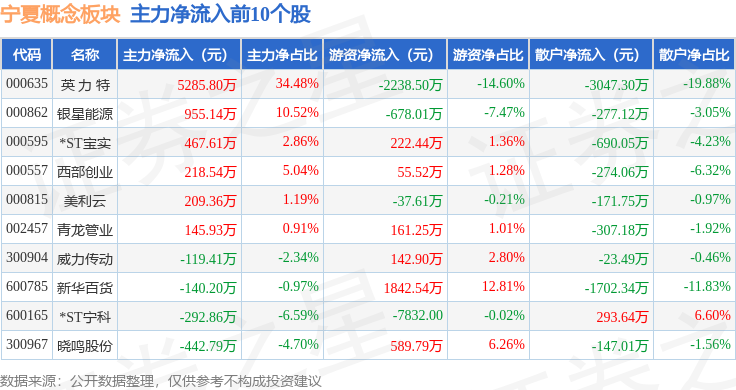 从资金流向上来看,当日宁夏概念板块主力资金净流出1.16亿元,游资资金净流入2022.27万元,散户资金净流入9603.43万元。宁夏概念板块个股资金流向见下表: