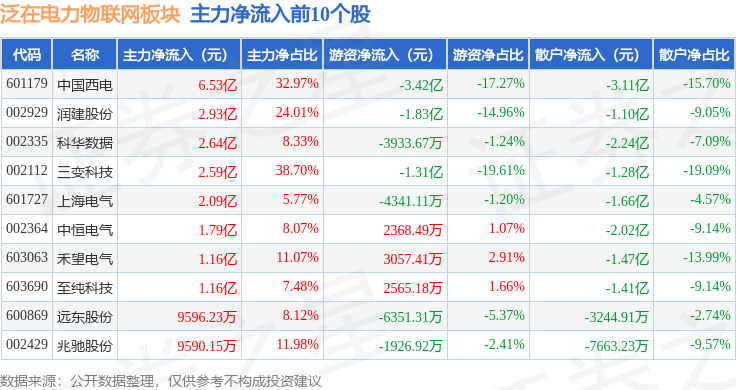 从资金流向上来看,当日泛在电力物联网板块主力资金净流入17.16亿元,游资资金净流出9.18亿元,散户资金净流出7.99亿元。泛在电力物联网板块个股资金流向见下表: