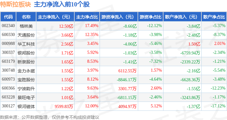 从资金流向上来看,当日特斯拉板块主力资金净流出111.76亿元,游资资金净流出6645.16万元,散户资金净流入112.43亿元。特斯拉板块个股资金流向见下表: