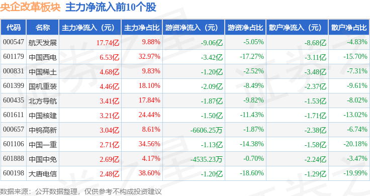 从资金流向上来看,当日央企改革板块主力资金净流出50.24亿元,游资资金净流出2.84亿元,散户资金净流入53.08亿元。央企改革板块个股资金流向见下表: