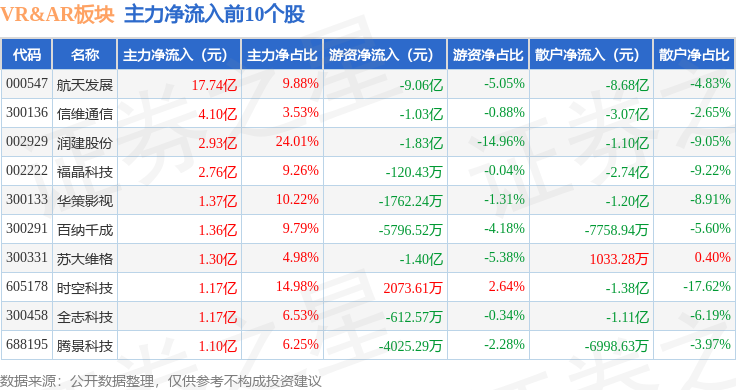 从资金流向上来看,当日VR&AR板块主力资金净流出96.32亿元,游资资金净流入13.71亿元,散户资金净流入82.61亿元。VR&AR板块个股资金流向见下表: